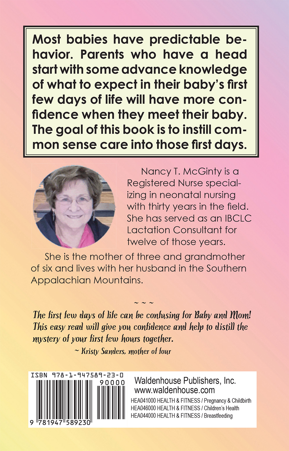 Babies and mothers change remarkably from day one, to day two, to day three. The goal of the lactation consultant who has written Translating the Language of the Newborn is to instill common sense care into the first three days of a baby’s life outside the womb. Parents’ questions on formula feeding, breastfeeding, lactation, latching on, burping, hunger signals, crying, sleep patterns, and more are answered from the newborn’s perspective and in the voice of the baby. This little book is very short, easy to read, and is an excellent reference for any new mommy or daddy.